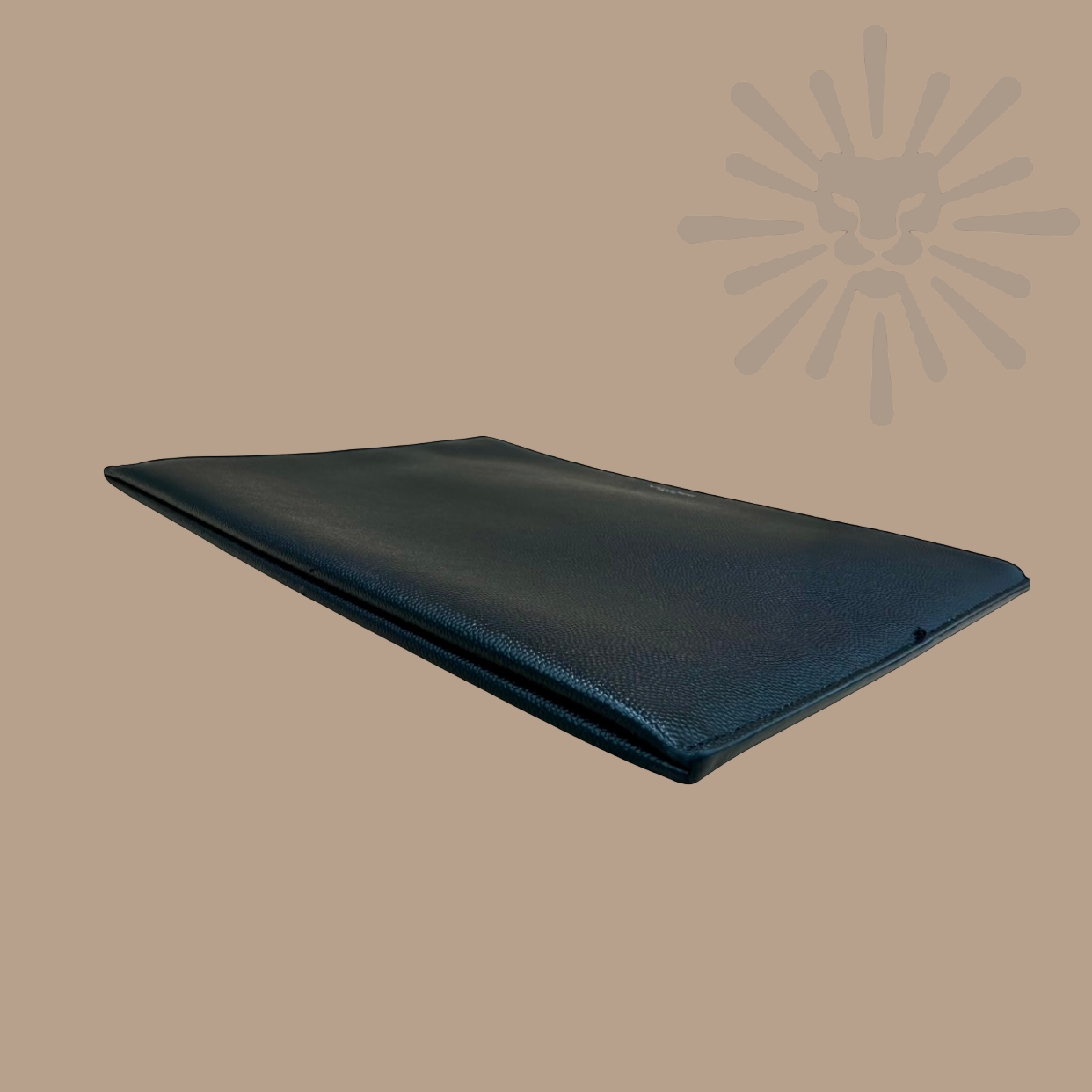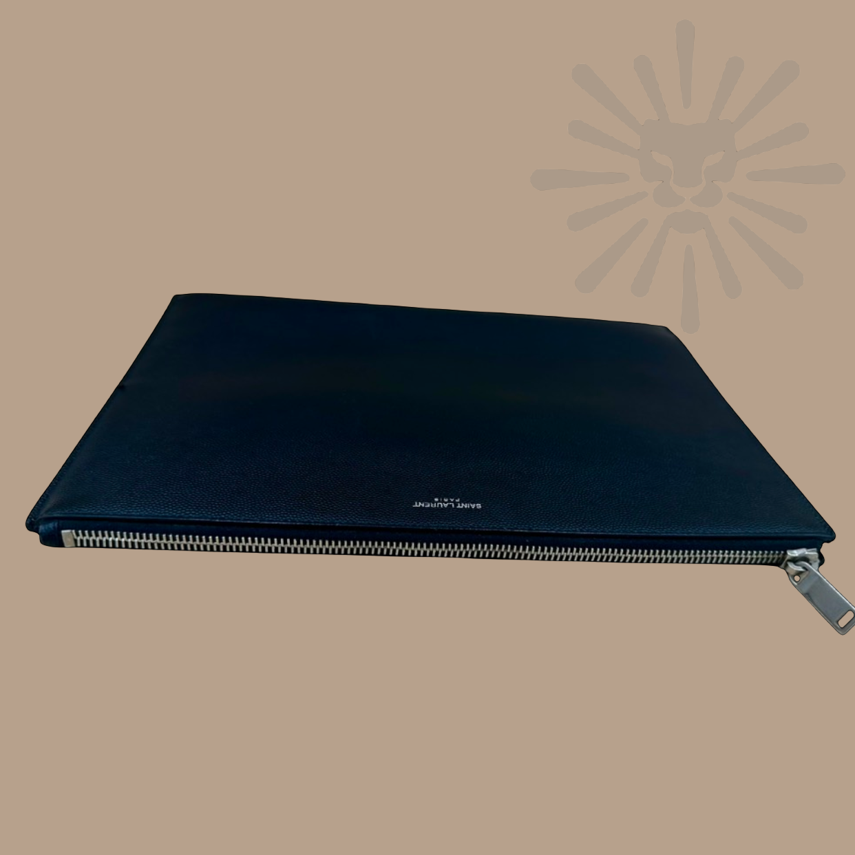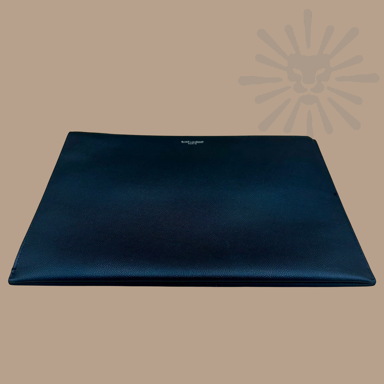 Step up your professional game with this true Saint Laurent classic: a smooth black leather portfolio pouch, stamped with discreet “Saint Laurent Paris” silver lettering and finished with luxe silver-tone hardware.